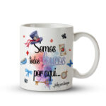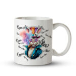 Entre no clima mágico de Alice no País das Maravilhas com esta caneca exclusiva. A estampa traz a famosa frase “Somos todos loucos por aqui” junto a elementos icônicos da história, como o chapéu do Chapeleiro Maluco, cartas, relógio e borboletas.
