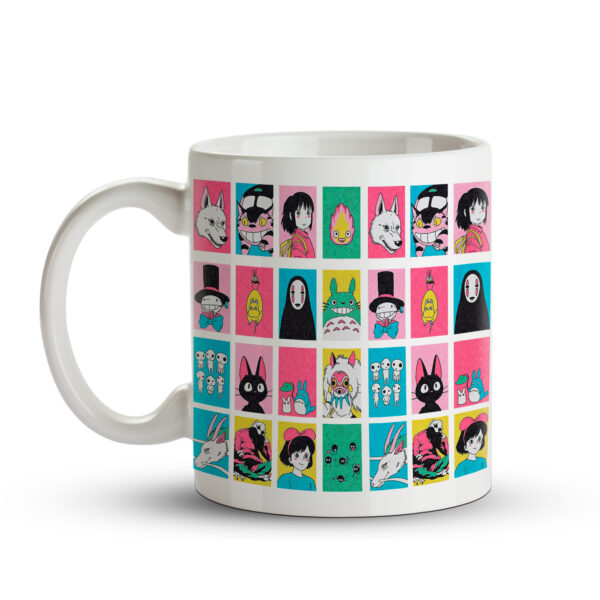 A Caneca Estrelas Ghibli reúne diversos personagens marcantes do universo Studio Ghibli em uma arte vibrante em estilo mosaico.