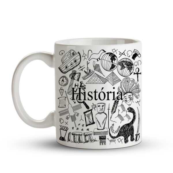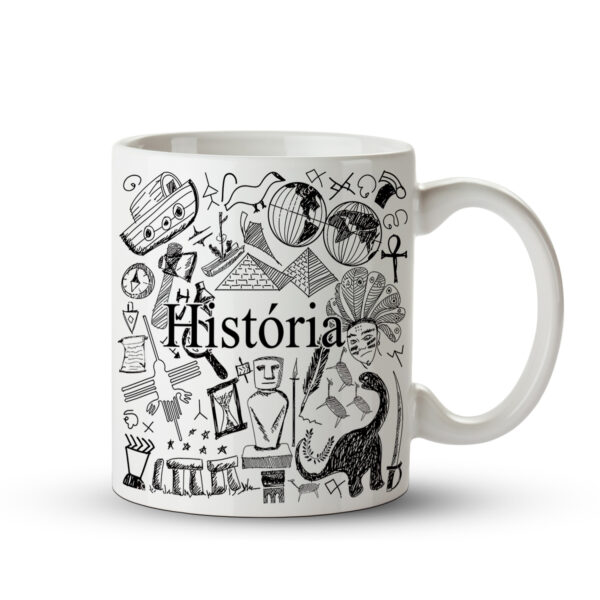 A Caneca História é um verdadeiro tributo às civilizações e acontecimentos que moldaram o mundo. Com uma estampa cheia de ícones representando períodos históricos, culturas e elementos clássicos como pirâmides, dinossauros, bustos e símbolos antigos, ela encanta quem vive mergulhado no estudo do tempo.