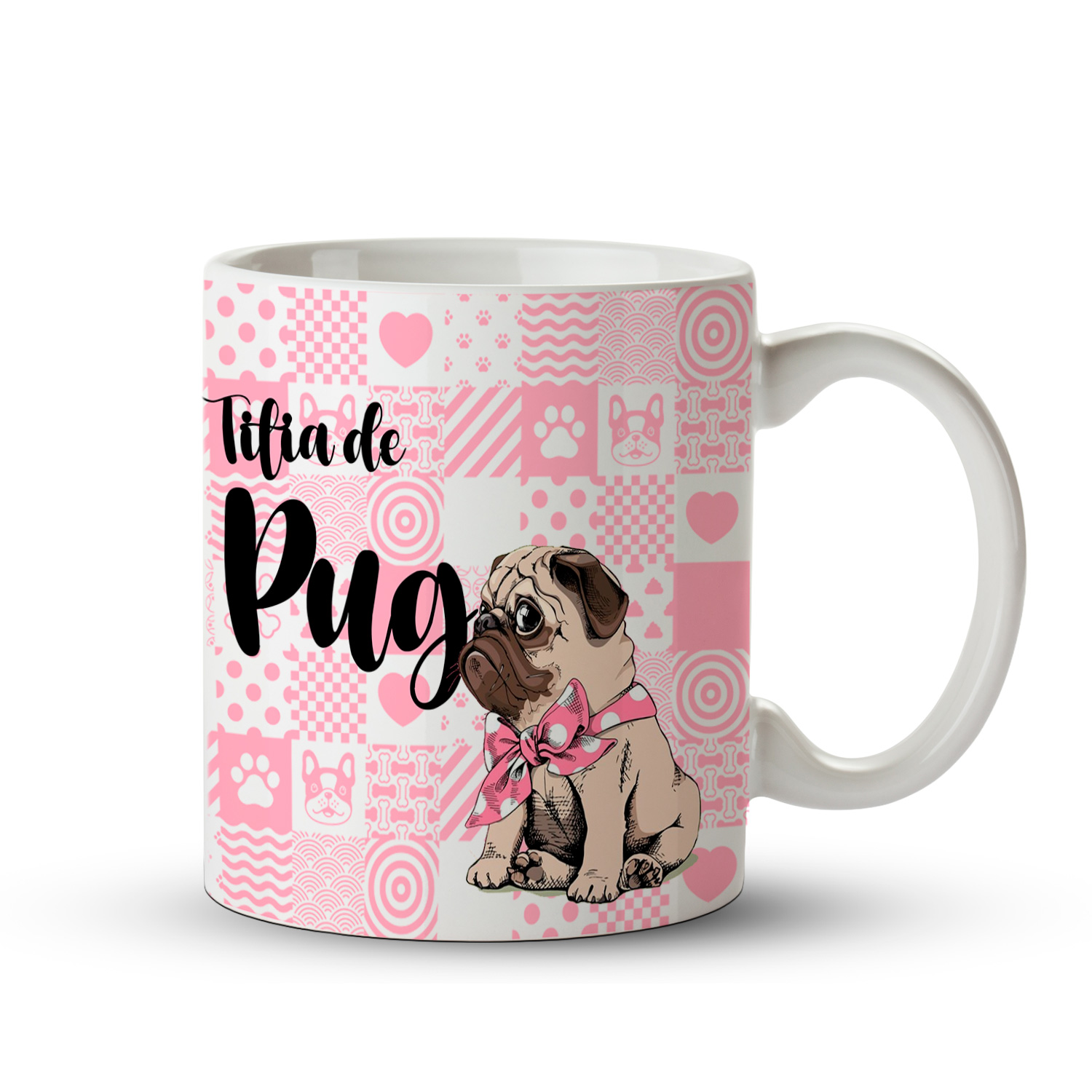Para quem é completamente apaixonada por seu pug, essa caneca é puro amor! Com fundo rosa em patchwork, patinhas, corações e um pug super fofo com lacinho, a frase “Mamãe de Pug” diz tudo.