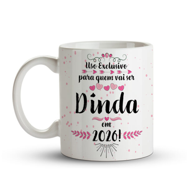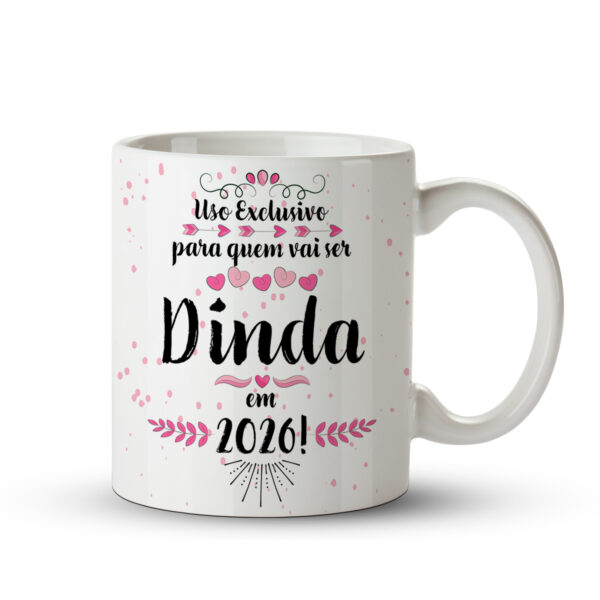 Com a frase “Uso exclusivo para quem vai ser Dinda!”, ela é perfeita para presentear aquela amiga, irmã ou pessoa especial que vai ganhar esse título cheio de amor. Seja durante um almoço, no chá revelação ou em um encontro surpresa, essa caneca transforma o anúncio em uma lembrança para a vida toda.