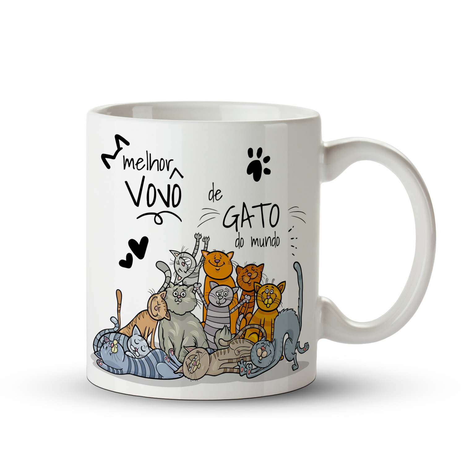 A “Caneca Vovô de Gato” traz um visual moderno e divertido, com estampa de rostinhos de gato e a frase que celebra os avôs mais carinhosos e gateiros do mundo. Um presente criativo, cheio de personalidade e amor felino.